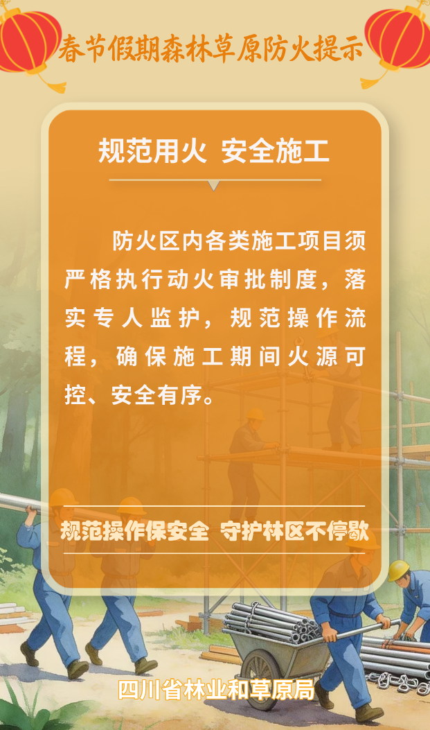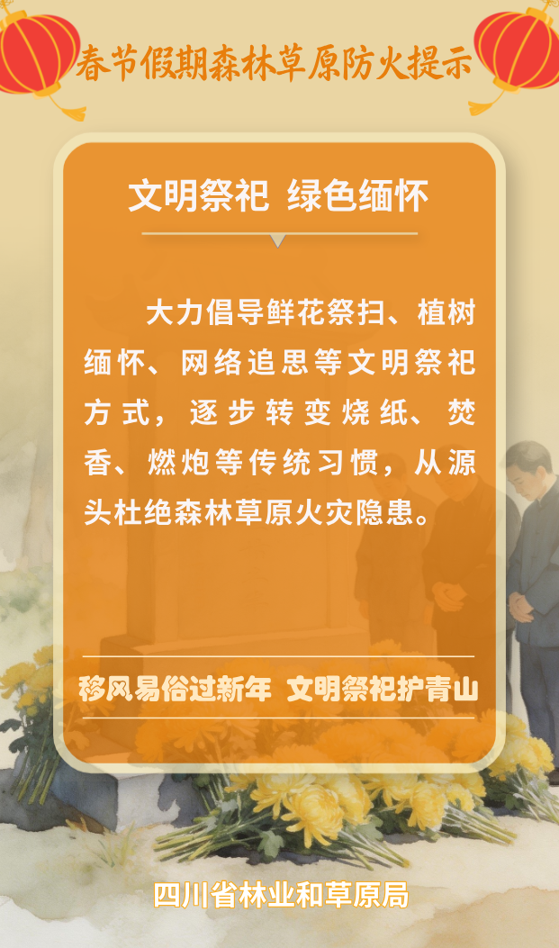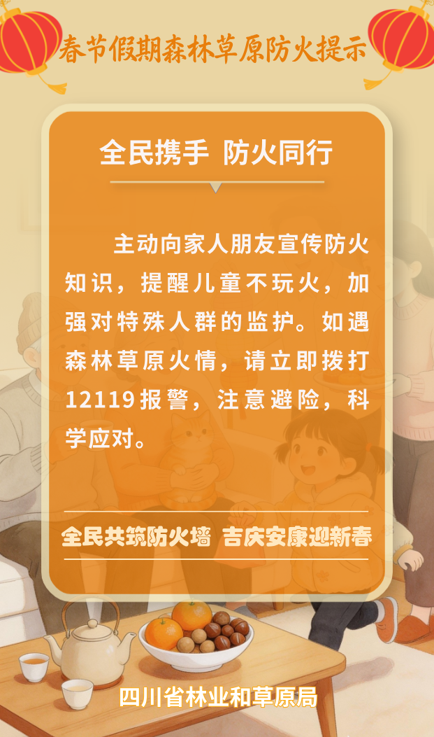 春节假期将至,万家团圆之际,更需筑牢安全防线。目前,四川省已进入森林高火险期(2月1日至5月10日),叠加气候干燥、祭祀用火、部分区域春节期间可限时燃放烟花爆竹、假期户外活动增多等因素,森林草原防火形势严峻。守护绿水青山,需要你我共同行动。让我们从点滴做起,以文明践行安全,用责任守护家园,携手营造平安祥和的节日氛围。